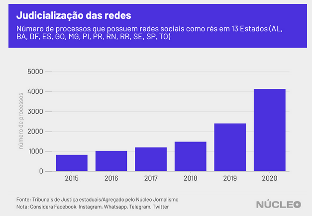 Empresas de redes sociais apareceram como rés em ao menos 4,1 mil processos em 13 Estados brasileiros em 2020, um aumento de 58% em comparação ao ano anterior, segundo dados obtidos pelo Núcleo junto a Tribunais de Justiça estaduais.